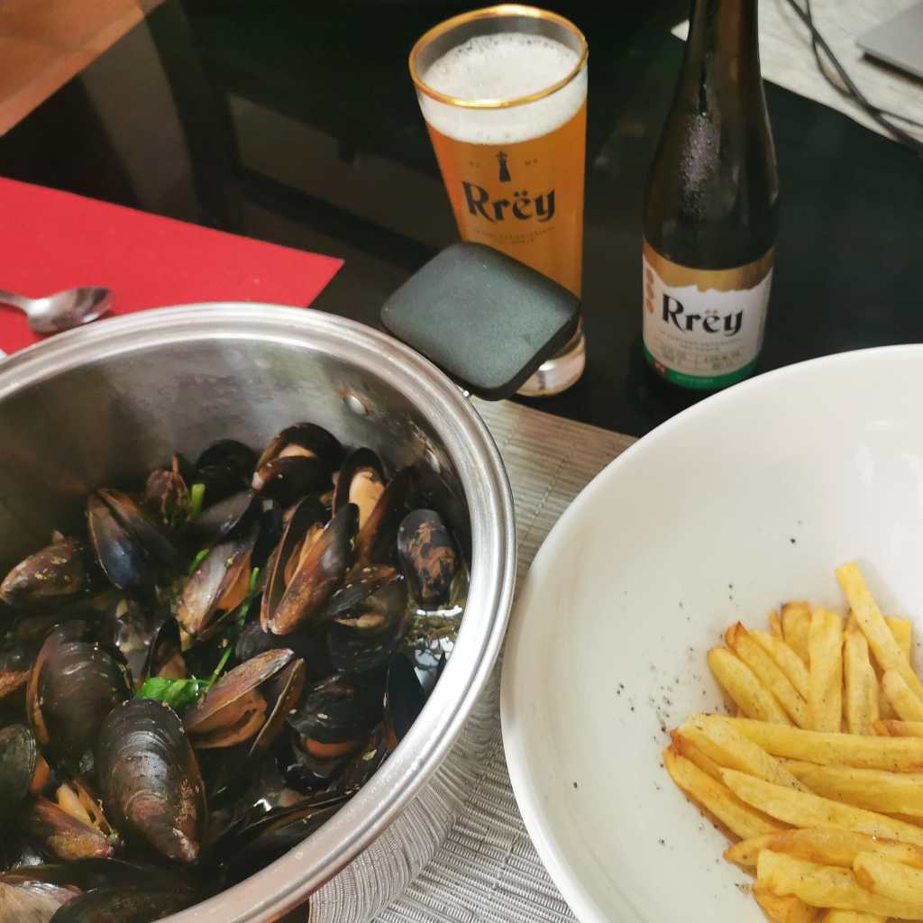 Mejillones a la marinera con papas fritas acompañados de cerveza Rrëy Whïte.